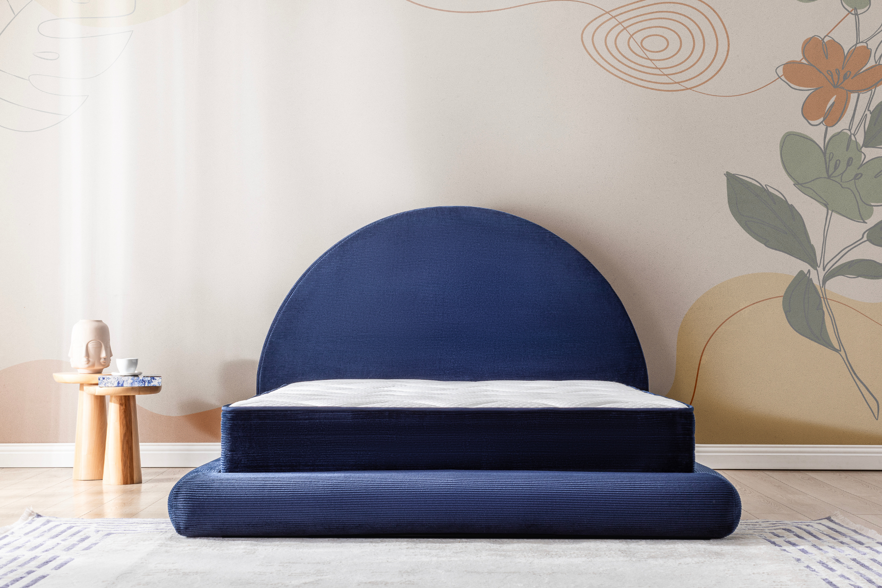 Yumuşak dokulu krem kumaşı, ferah ve sade bir atmosfer yaratırken; yarım daire formundaki başlık, yatak odasına mimari bir ifade kazandırır.