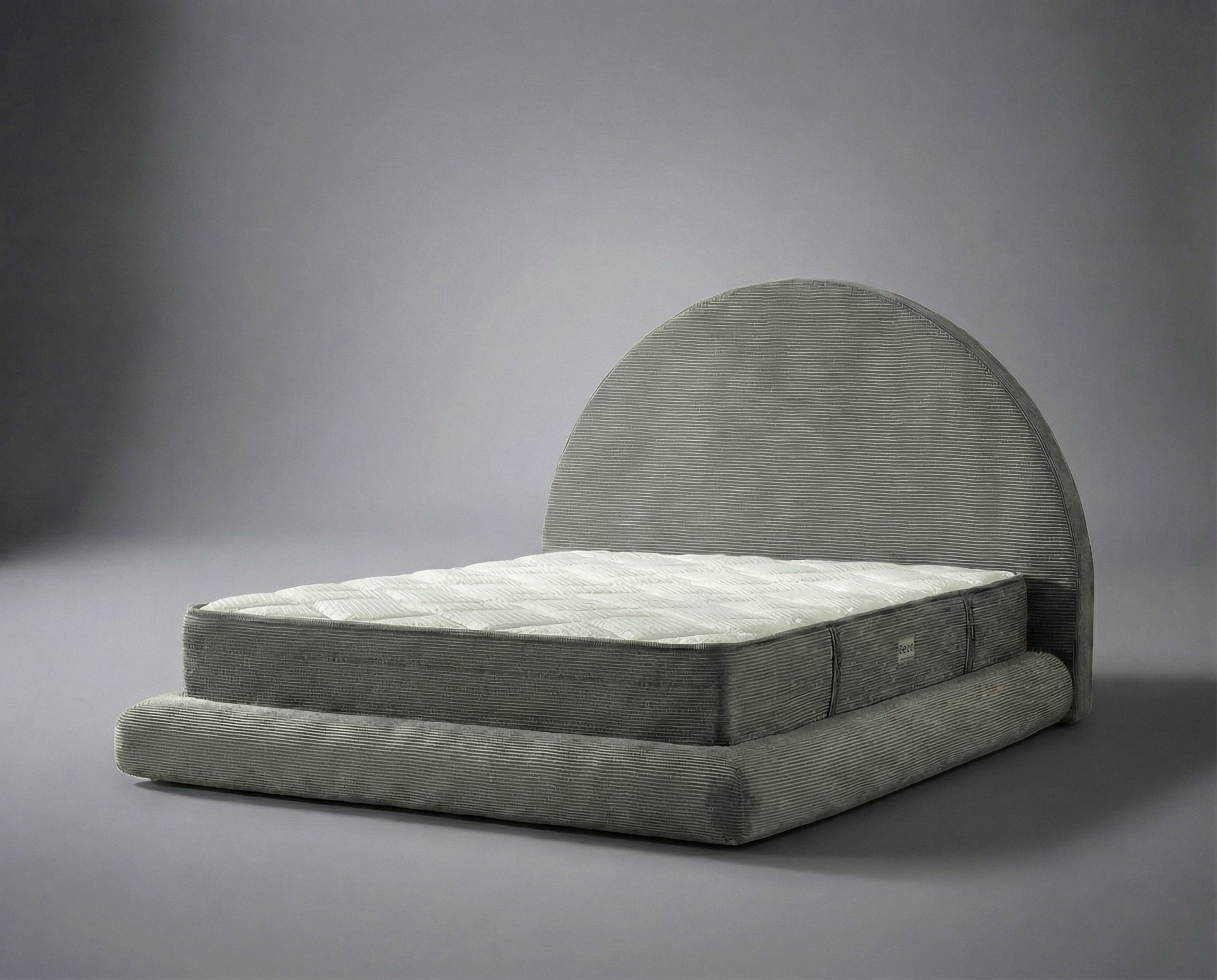 Yumuşak dokulu krem kumaşı, ferah ve sade bir atmosfer yaratırken; yarım daire formundaki başlık, yatak odasına mimari bir ifade kazandırır.