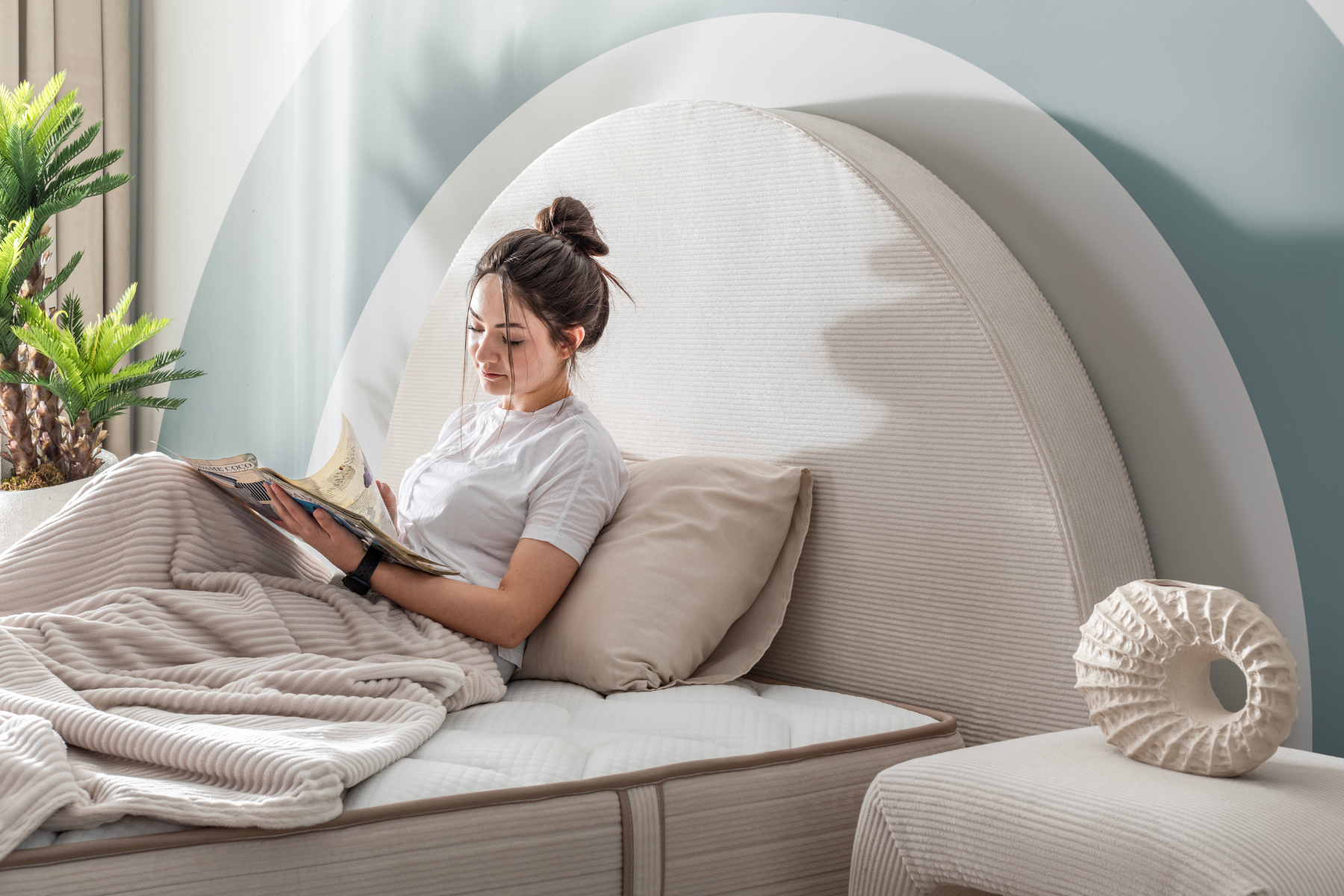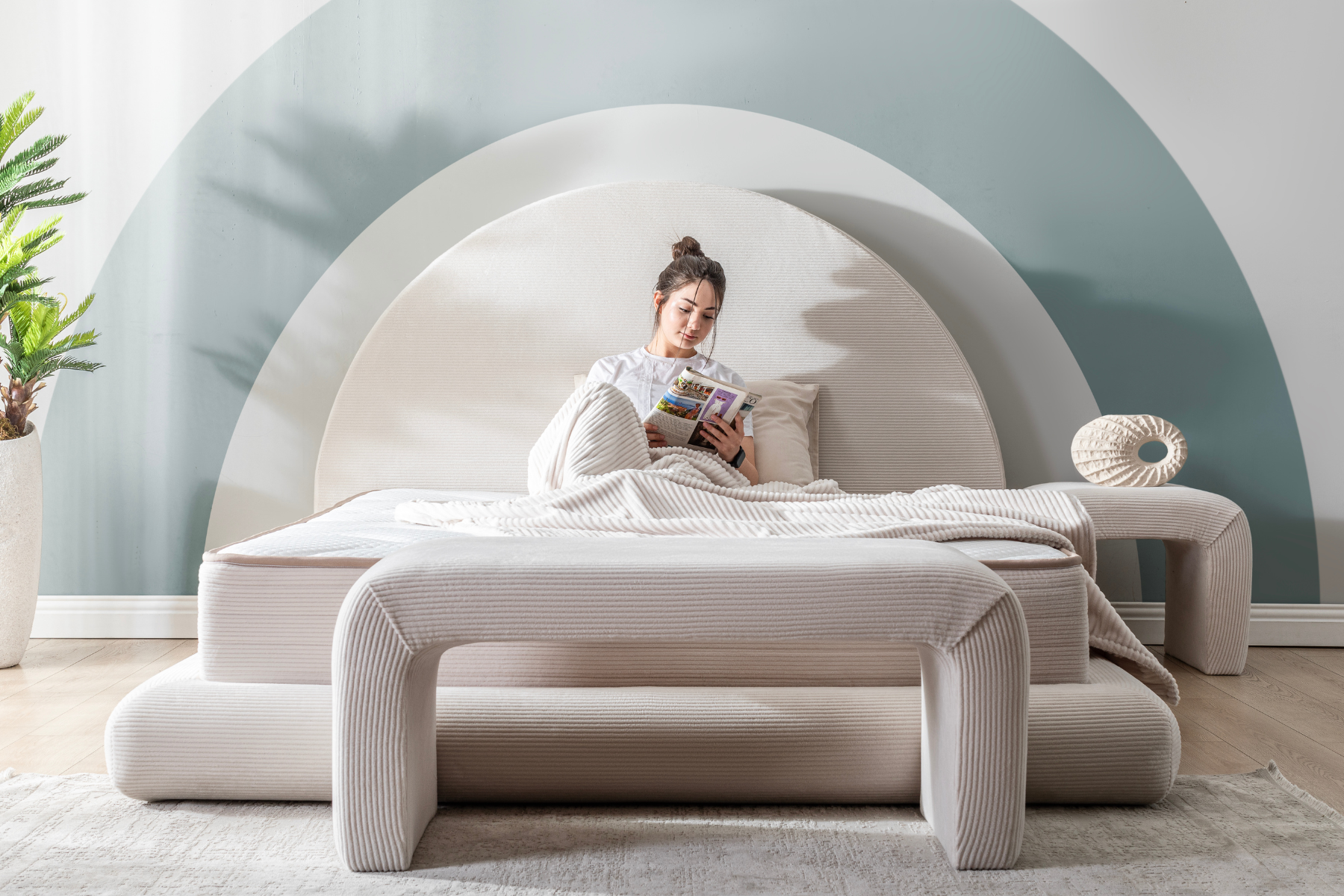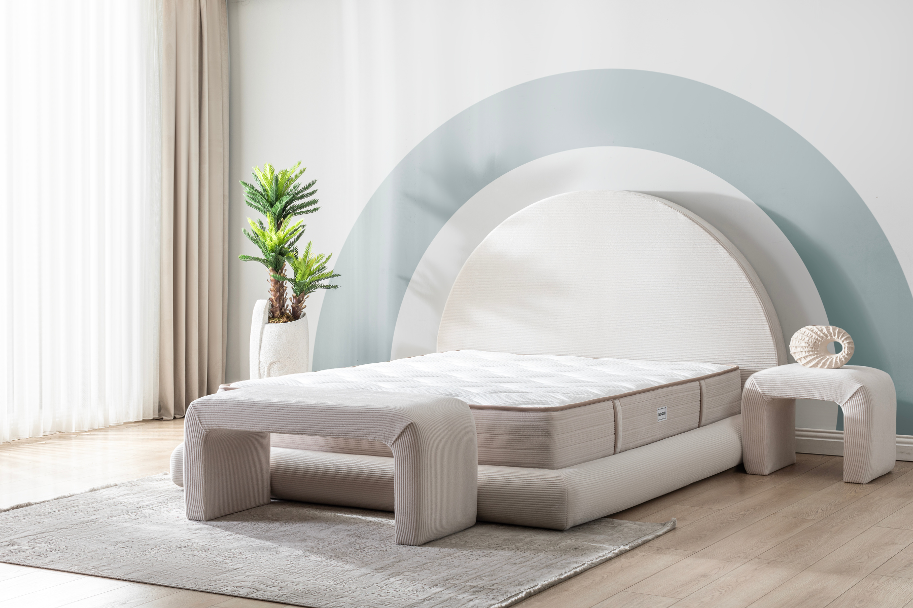 Yumuşak dokulu krem kumaşı, ferah ve sade bir atmosfer yaratırken; yarım daire formundaki başlık, yatak odasına mimari bir ifade kazandırır.