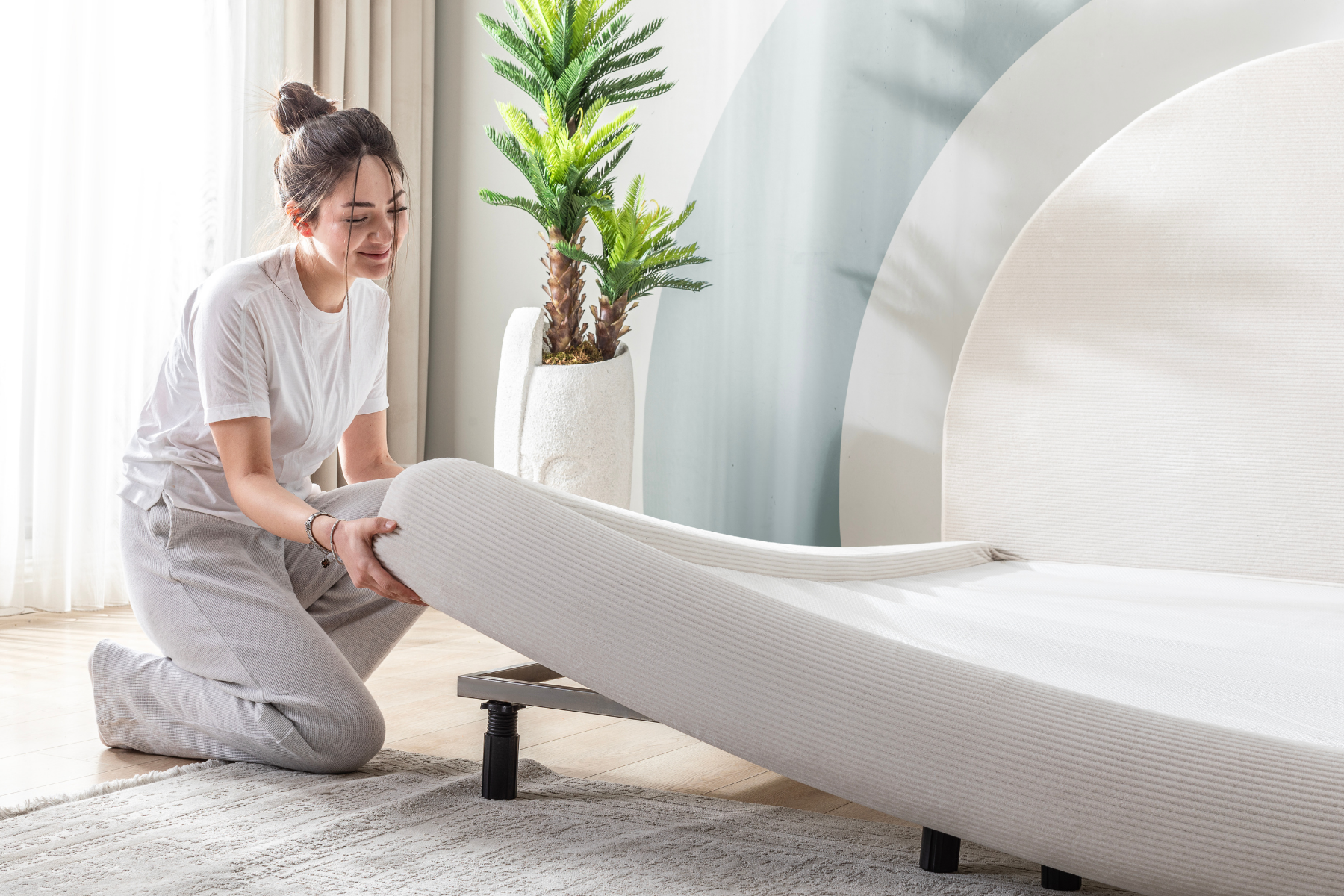 48 cm yüksekliğe sahip baza ve yatak birleşimi, sadece estetik değil, aynı zamanda ergonomik bir oturma ve yatma yüksekliği sunar.