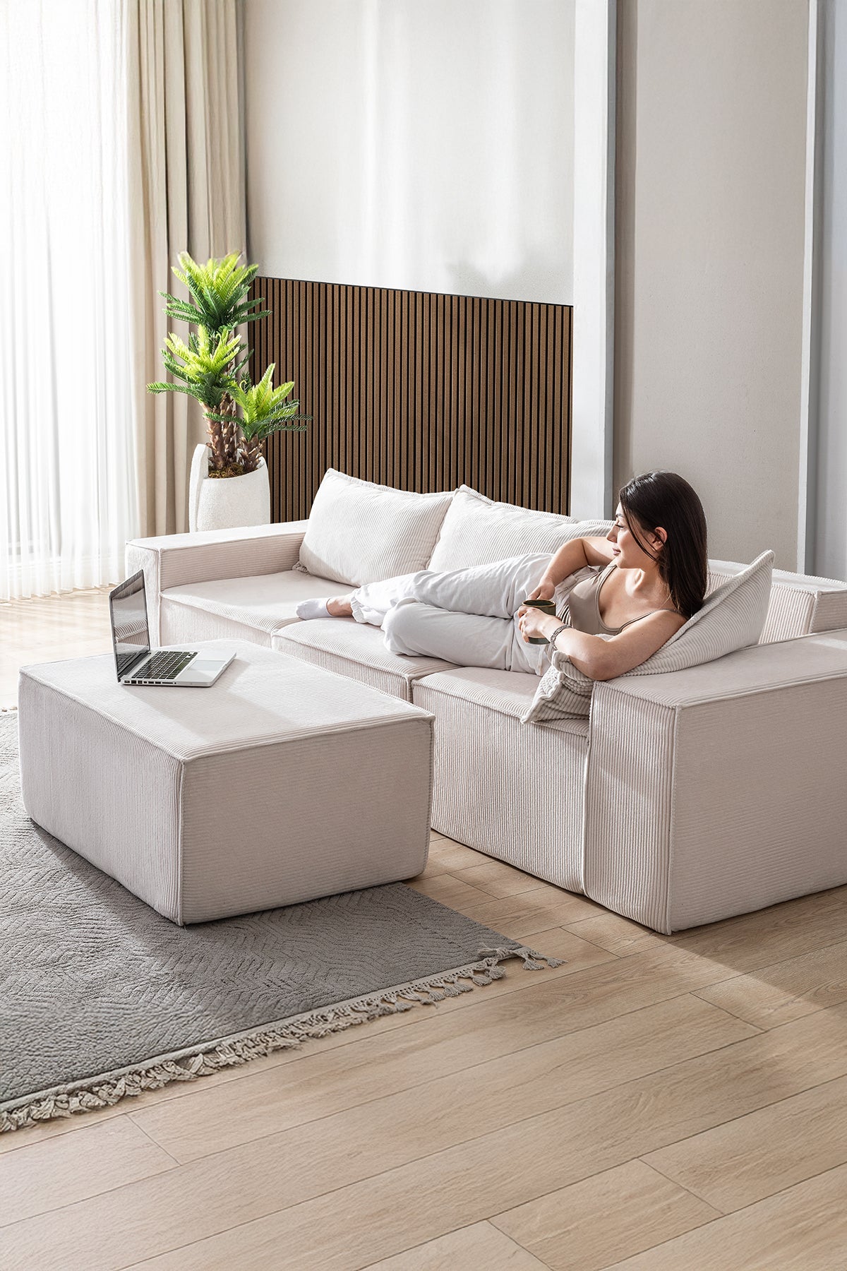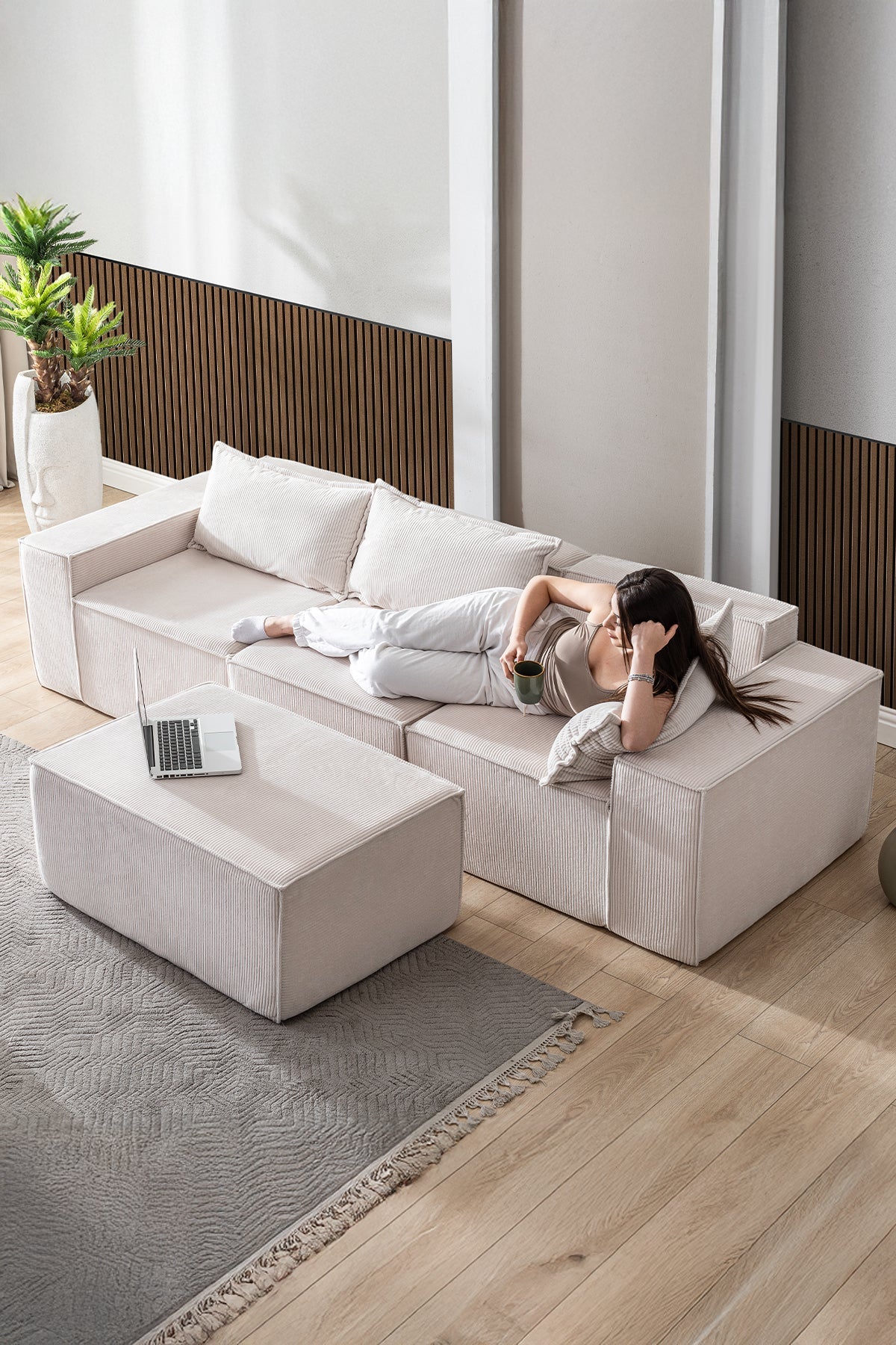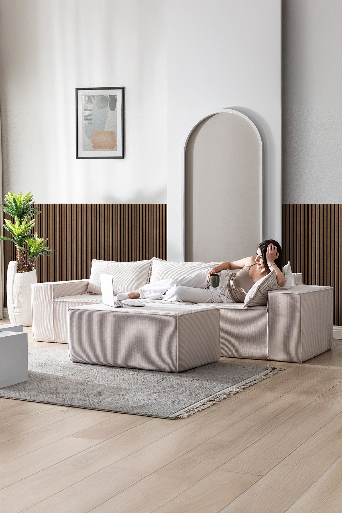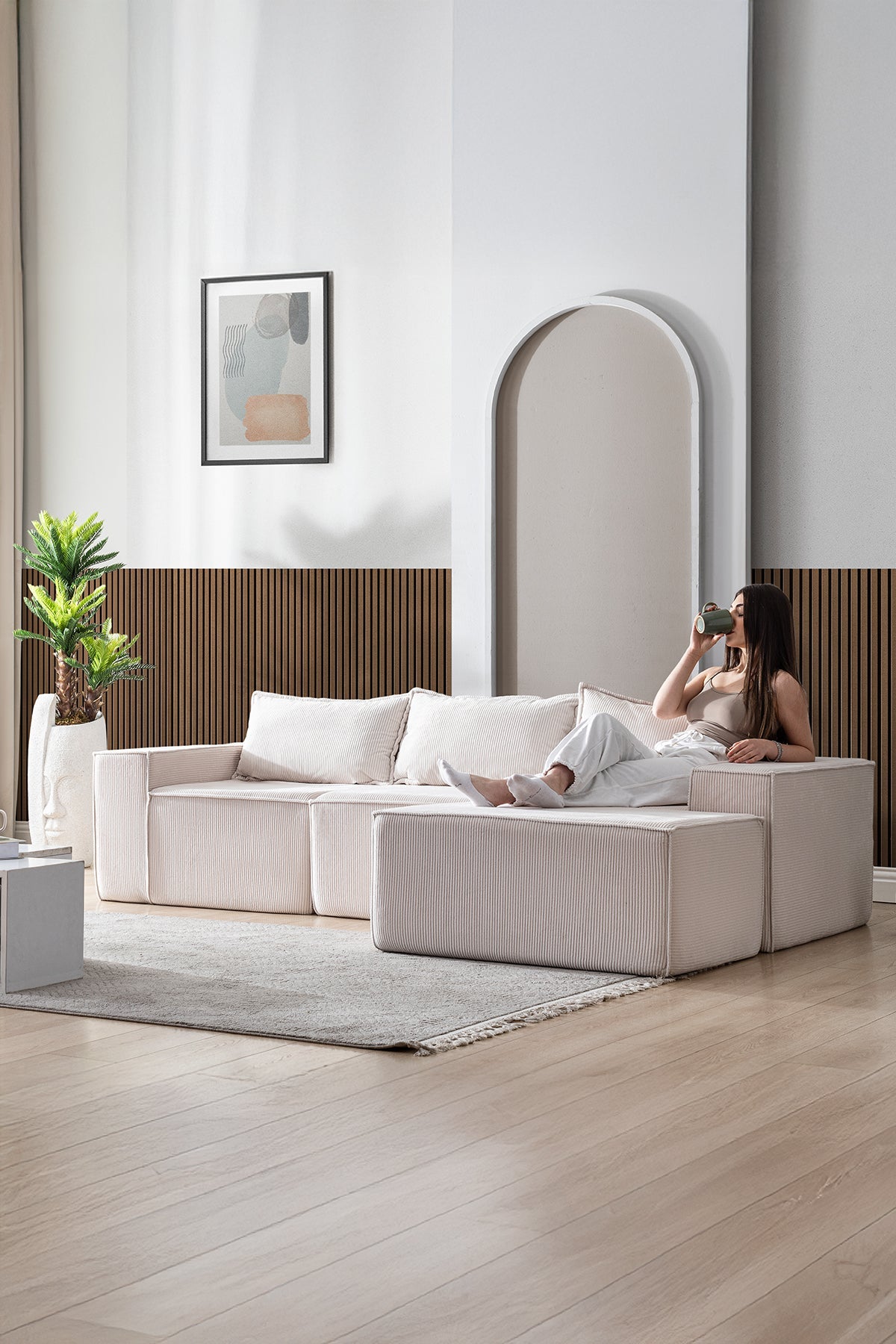 İskeletsiz yapısıyla ağırlıktan uzak, tamamen süngerden oluşan bu koltuk; vücudu kavrayan formu, yönü değiştirilebilir tasarımı ve teddy kumaşın yumuşak dokusuyla yaşam alanına hafiflik ve sadelik katar.