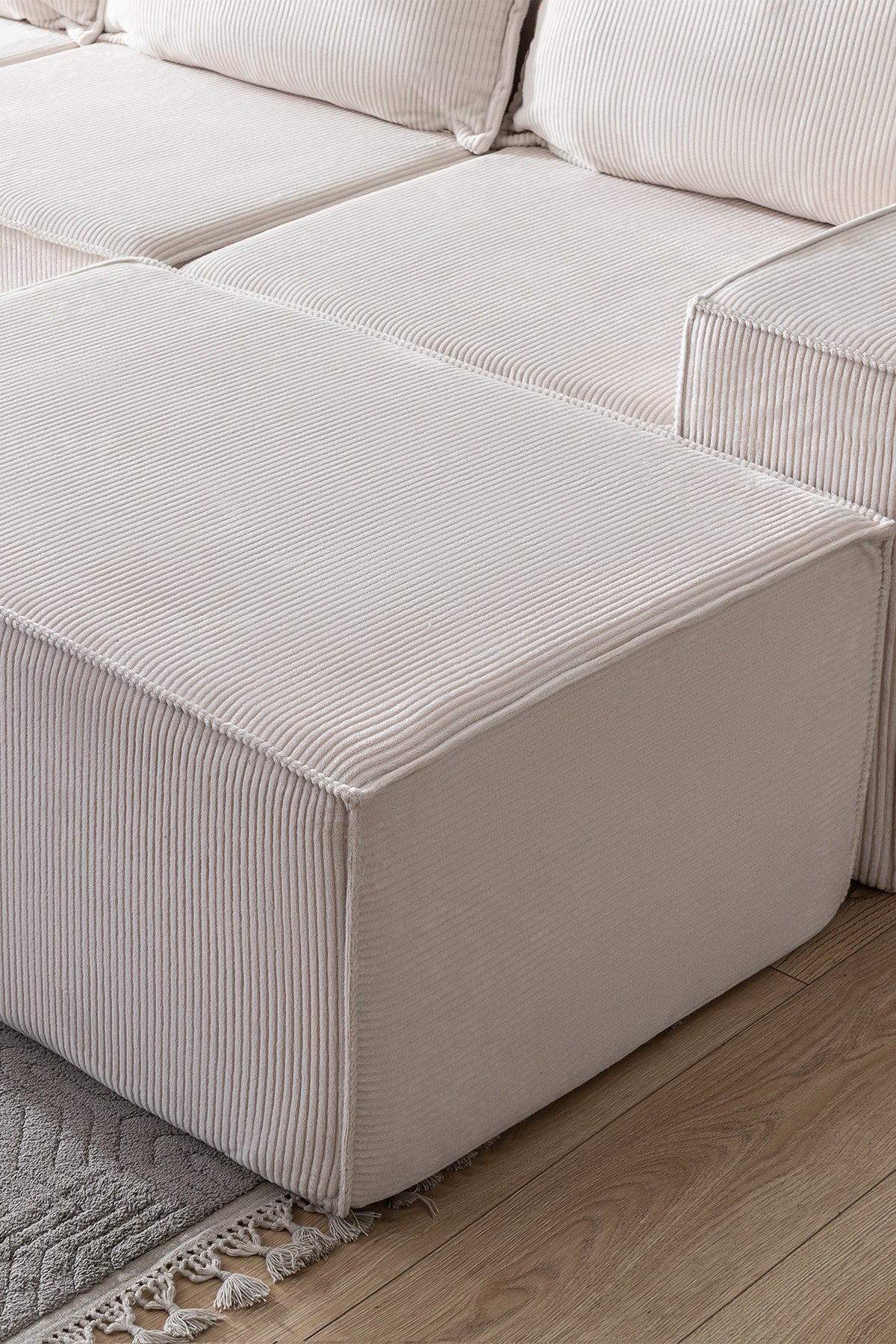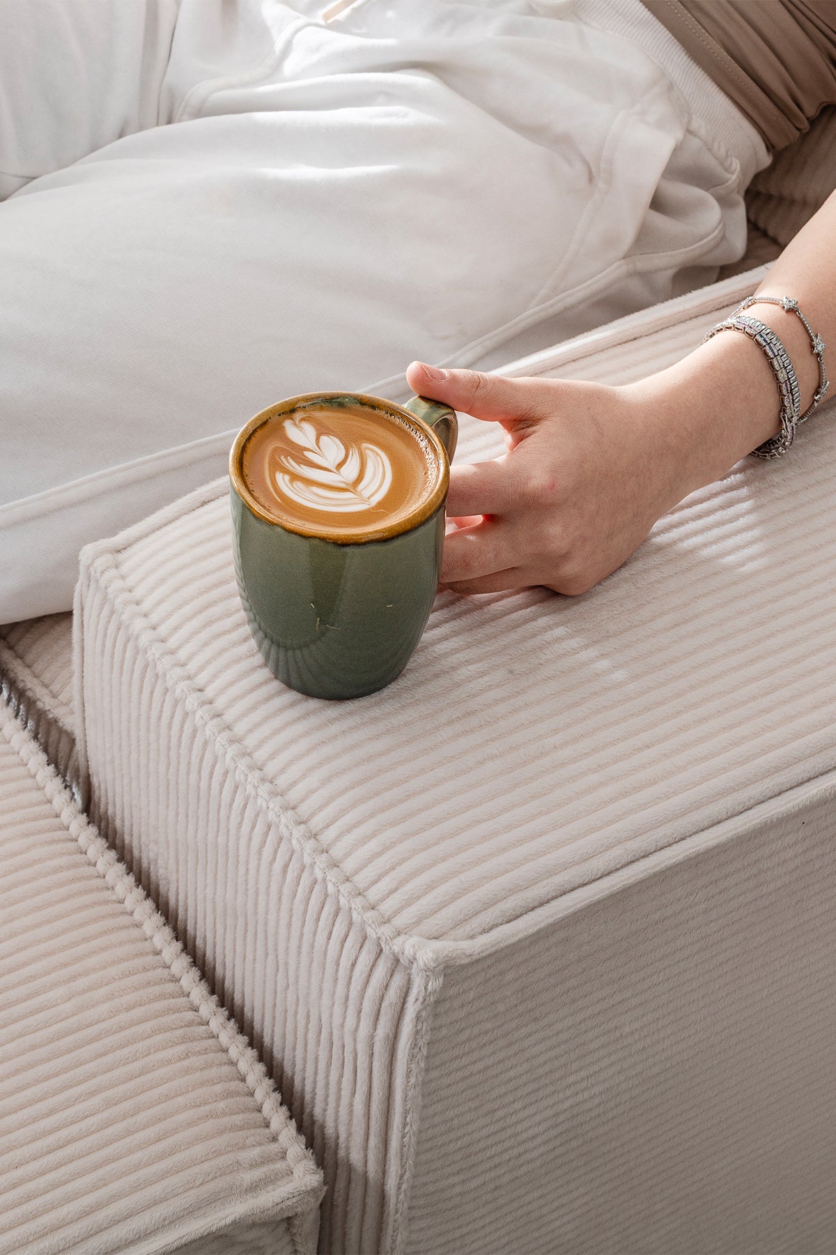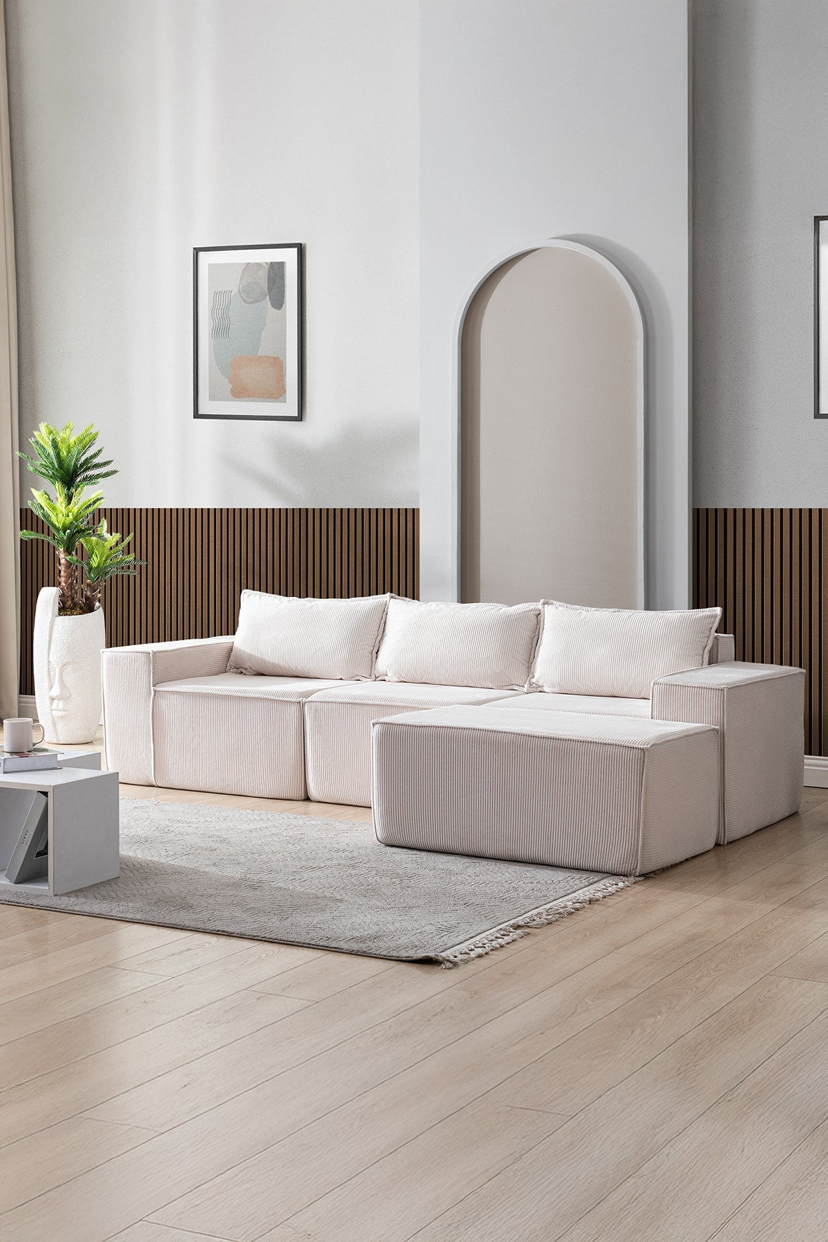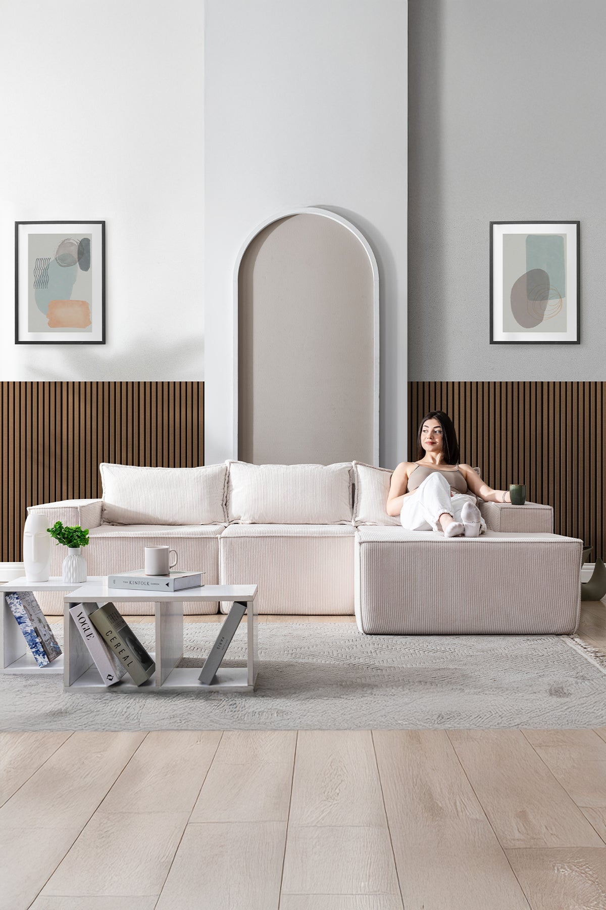 İskeletsiz yapısıyla ağırlıktan uzak, tamamen süngerden oluşan bu koltuk; vücudu kavrayan formu, yönü değiştirilebilir tasarımı ve teddy kumaşın yumuşak dokusuyla yaşam alanına hafiflik ve sadelik katar.